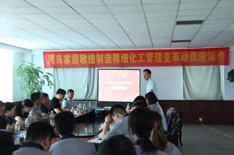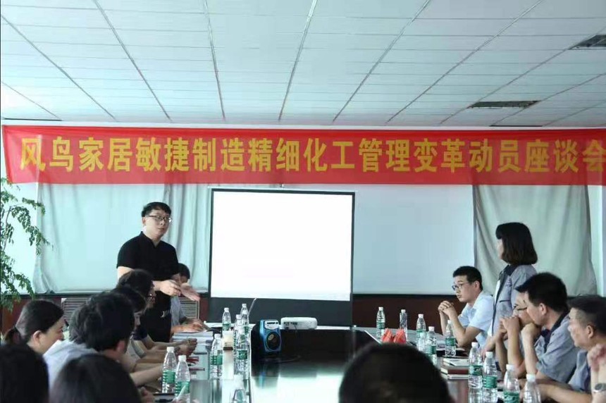 并肩同行,重新起航——风鸟家居敏捷制造-整木管理自动转项目启动时间:2018-07-18 驻厂辅导企业简介: 风鸟家居有限公司成立于2002年,经过17年的探索与发展,现如今已发展成集家居产品设计研发与产销为一体的知名品牌,并打造跨越建材与家具行业的高端整体家居品牌形象。风鸟主营产品包含:墙板、整体衣帽间、整体橱柜、木门、楼梯以及床、沙发、餐桌椅等家具。产品风格涵盖:米兰风格、洛可可风格、托斯卡纳风格、威尼斯风格、乔治亚风格、新古典风格、新中式风格,并以独特的“家居高级定制”理念、超百人的设计队伍和100000㎡的工厂面积致力为顾客打造梦想之居。 2018年7月16日,风鸟家居携手华钥企管举行了风鸟敏捷制造精细化管理变革动员座谈会。风鸟总经理崔总、各部门管理代表及华钥企管总经理刘总、项目老师共同参加本次会议。 会议中,崔总在发言中强调了会议的严肃性,并指出目前公司存在的问题点,对华钥企管团的高度期望,表达了引进华钥团队进行管理变革与提升的决心。带头表决心:全面配合老师的作,提升风鸟的业绩及管理技能。