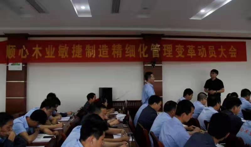 顺心木业管理变革开启新篇章时间:2018-05-10 驻厂企业简介: 安徽顺心木业投产于2005年,专注高端木门、楼梯、酒窖、护墙、衣柜、衣帽间、家庭影院等系列原木与复合整木定制产品,是集研发、设计、生产、销售、服务为一体的一站式专业整木定制家居企业。顺心木业一直以来“致力于高品质家居生活、美好梦想的缔造者和领导者”为愿景,携手全国工商联家具装饰业商会数载,以“山高人为峰,一群人,一条心,一定行”的信念,取你我所长补你我所短,以你我之力足你我之需,以“传承徽商精神, 融合至臻匠心,专注整木定制,打造行业典范”承担着社会责任。 (图为顺心木业殷总发言) 2018年5月8日,顺心木业敏捷制造精细化管理启动大会于顺利召开,有二次创业的决心和优秀的管理团队,顺心木业将是新的整木定制标杆企业。顺心总经理殷久和先生、各部门管理代表及华钥企管总经理刘春风先生、华钥驻厂老师共同参加了本次会议。 殷总表示对华钥企管团队及管理变革的肯定,并向在座的所有各部门管理代表传达了管理变革的重要性,随着市场竞争环境的不断变化,目前公司的管理模式及产能已经不能满足公司的发展及客户需求,为了扭转这种局面,必须借助外力、必须通过变革的方式来快速提升公司产能及业绩,这是华钥咨询团队入驻顺心的最终目的。 (图为华钥企管刘总发言) 华钥企管总经理刘总主导了整个会议过程,当顺心各部门管理代表指出目前遇到困惑和瓶颈时,刘总总结出几项观点: ①思维系统化:任何一个环节的优化都离不开其他环节的支撑,简单解决单点的问题,只能是事倍功半,只能救救火。 ②制造均衡化:从接单、设计、备料、木工、油漆等等所有车间产能负荷均衡。 ③执行力来源于执行,责任心来源于责任,量变引起质变。 ④竞争是社会发展的原动力,每个人都有竞争的基因。 ⑤目标清晰,结果为导向,前推后拉。 变革是一场没有硝烟的战争,拼的是勇气,讲的是规范,看的是未来,相信顺心木业在不久的将来能发生真正的变化!
