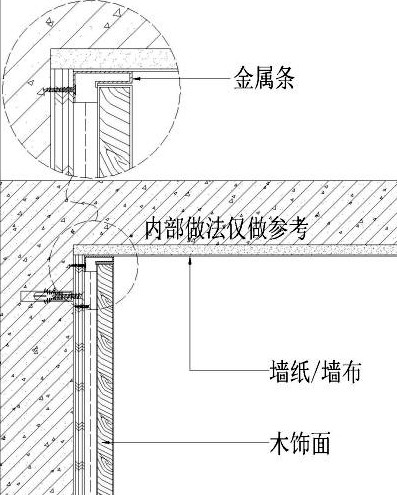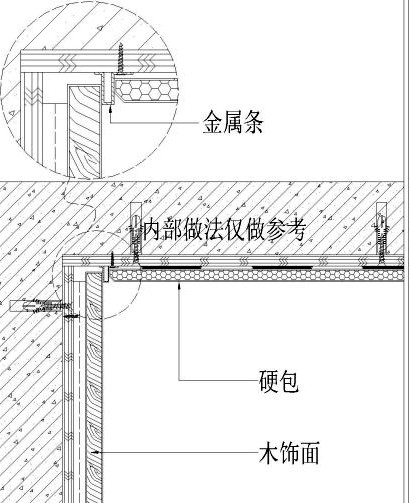 PS:开始之前先明确一点,本期所提到的木饰面,如未做特殊说明,均为常规的木饰面板,也就是厚度>12mm的厚板。 材料收口的总原则 不管面对任何装饰材料的收口问题,都有一套科学的规律可循,其中,你必须要遵守下面这条铁律。 所有收口,尽量都在阴角,哪怕在平面上收口,也千万不要在阳角收口。如果不得不在阳角收口时,也要想办法把阳角转换成平面或者阴角。 在这个铁律的基础上,你应该分两步去分析收边收口的问题; 第一步:谁和谁收? 第1步一定是了解谁和谁收口;明确收口的是什么材料跟什么材料、谁来收谁的口,谁来压谁、在哪儿收口、如果不收口会怎么样?能不能改变收口方式。明确这些必要条件后,才能判断使用的收口方法。 第二步:适用什么收口形式? 任何分析都是这样,只有当你了解它的前因后果以及环境因素后,才能动用行之有效的方法论对它进行快速处理。在你明确了谁和谁收口后,就可以从下面这5种形式中,选择适合的一种甚至是多种形式的组合,用于解决你面对的收口问题; 根据第一步,我把木饰面的收口类型拆分为“木饰面与木饰面收口”与“木饰面与其他材料收口”两部分来讲解,下面先看木饰面与木饰面的收口情况; 一、木饰面平面收口 1、从材料特性和安装运输的角度来看,单块木饰面的规格不建议>2400mm*1200mm,因为大于该尺度后, 一是木饰面的基层板需要拼接后才能贴皮,增加了单块木饰面的成本, 二是>2400mm后的木饰面单板是不便于运输和安装。 所以,在你的设计项目中,大面积采用木饰面时,一定要从最后落地的角度来控制木饰面进行工艺缝的预留,否则,项目落地后,木饰面的分缝必然会影响设计效果,因为,现场人员下单时,是不会考虑设计效果的,就如下图所示。▼ 大厅墙面背景图▲ 2.为了避免上面的情况发生,作为深化设计师,你在对木饰面进行分缝时,应当遵循下面几条原则: 2.1、尽量按标准单板的尺寸来分割,即尺度在2400*1200之间; 2.2、一个墙面或空间,尽量减少单板木饰面的尺寸,可有效的降低成本且保证美观度; 2.3、如果有顶角线和踢脚线,尽量考虑和中间的木饰面分开做,不建议集成在一起,既方便运输又方便安装。 3、在拼接两块木饰面板时,主要是采用“留缝”和“对撞”的方式来对工艺缝进行收口。一般会有下列三种拼接情况; 01 U形工艺缝拼接 02 V形工艺缝拼接 03 密缝工艺缝拼接 4、以上三种方式是木饰面分割时工艺缝的最常见形式,当然,在使用它们时,你应该知道下面这些注意事项: 4.1、工艺缝尺度‹ 5mm时,只能做与大面相近的油漆来饰面,工艺缝≥5mm时,槽内则可贴木皮做油漆,所以,建议工艺缝的尺度≥5mm为宜。 4.2、木饰面的拼缝处,应尽量避免人的视线范围。 4.3、要想做大面积无缝的木饰面板,可以采用薄木贴面板的方式来实现,其收缩性会小于采用木饰面厚板来做。 5、你可能会有疑问,通过压条的方式来做收木饰面单板不行吗? 答案是,当然可以呀,就像上面这样; 但是,在木饰面与木饰面板块间的平面收口中,除非有设计造型,否则是不会采用压条的形式来收口的,因为你想像一下,若采用压条的形式来做木饰面自身的收口,那岂不是每隔一块板幅就要走一圈收边条,这样一样,不就得不偿失了吗? 二、木饰面阳角收口 木饰面板阳角开裂▲ 木饰面的节点图▲ 以上图片是木饰面最常见的阳角处开裂的情况,之所以开裂是因为在工厂制作,还是运输途中,以及现场的搬运及安装,木饰面的阳角一定会收到不同程度的磕碰,所以,如果没有对其阳角处进行加固处理,直接采用45°拼角,那么必然会出现问题的。所以,你可以这样进行优化; 方案一 保留45°拼角,背后采用三角撑固定; 这样做的好处是保留了阳角硬朗转折的设计效果,但坏处是后期开裂的风险较大,因为,它的收口毕竟是在阳角上,而且还会存在角度太过尖锐从而撞伤人的情况发生。 所以,根据我们提出的收口原则,能在阴角或平面收口时,尽量把口守在阴角和平面。因此,在此基础上,可以做出如下优化方案。 收口变为阴角或平面 海棠角木饰面▲ 阳角收口的常见样式▲ 像上面这样把阳角转为阴角的好处是,可以比方案一更好的抗开裂,但是缺点是转角处就不能保持方案一的硬朗了。不过,若采用5*5mm的海棠角,从设计角度来看,既为整个空间增加了细节,还不影响空间效果,一举两得。 阳角一侧收口▲ 当然,这里注意一点,若采用把阳角收口变为在一侧平面收口的情况,因将平面上的工艺槽尽可能留在人的正常视线范围以外(非主视面)。 木饰面阳角收口案例▲ 三、木饰面阴角收口 1、阴角不同于阳角,开裂的情况比较少见,所以很多设计师在做木饰面阴角的深化时,一般都会采用和石材阴角收口一样的方法来绘制节点图纸,就如下图所示: 木饰面阴角收口节点图▲ 2、但是,这样做会有新的问题出现,即木饰面受外界温度的影响,导致含水率的不稳定,从而形成收缩缝,最后导致阴角出现空洞的情况发生。如下图所示: 木饰面收缩导致阴角工艺缝处收缩出现空洞▲ 3、虽然木材的收缩是没法避免的,但是我们可以和木地板的做法一样,在节点图上,给木饰面的阴角留一些伸缩缝,保证它自身收缩后,不至于从表面就能看出来,就像下面这样优化; 阴角线优化方案↑ 成品木饰面阴角样板▲ 木饰面收缩导致与其他材料的阴角处收缩开裂▲ 节点优化过程图↑ 四、木饰面踢脚线